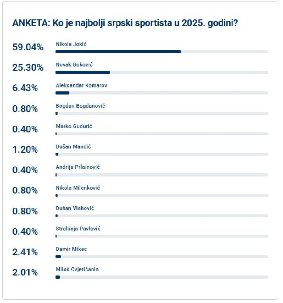 Srpski reprezentativac osvojio je ubedljivo najveći procenat glasova – čak 59,04 odsto, ostavivši iza sebe veliku konkurenciju sastavljenu od košarkaša, fudbalera, vaterpolista, boraca i sportista iz drugih disciplina.