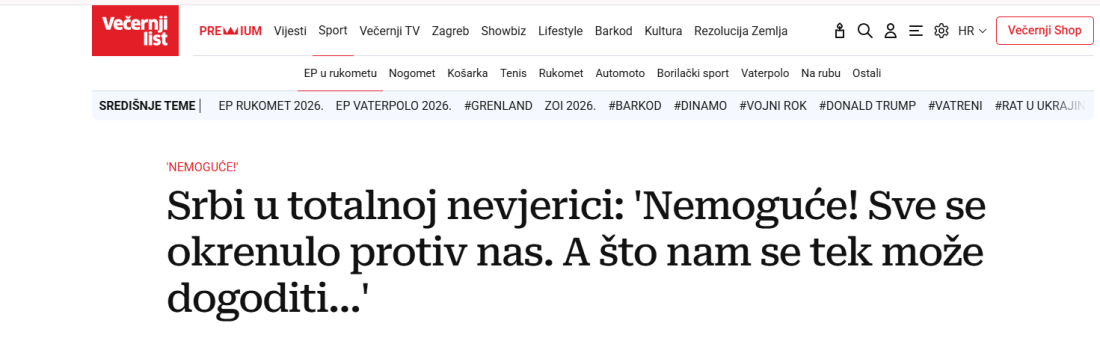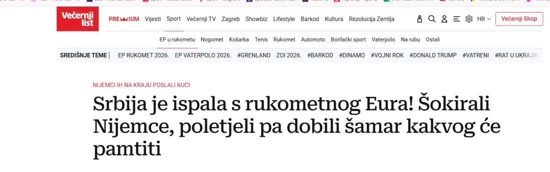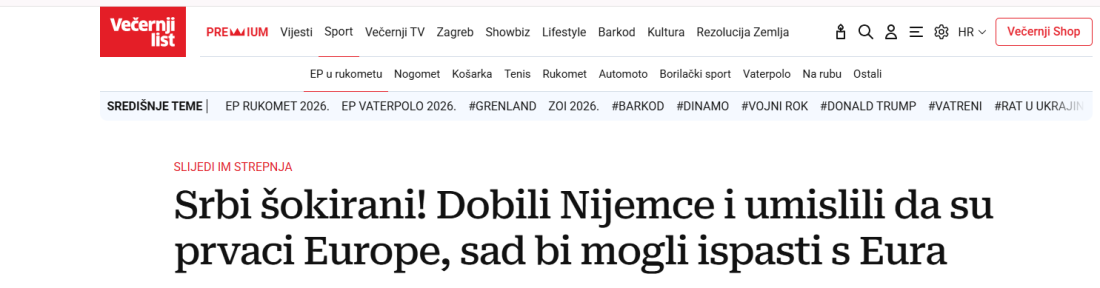 Komšije se naslađuju našom eliminacijom, jedva su Hrvati dočekali poraz Srbija. "Večernji list" je našoj reprezntaciji posvetio nekoliko tekstova, pa posle meča sa Austrijom piše: "Srbi šokirani! Dobili Nemce i umislili da su prvaci Evrope, sad bi mogli ispasti s Eura", potom je usleduo još jedan s naslovom: "Srbija je ispala s rukometnog Eura! Šokirali Nemce, poleteli pa dobili šamar kakvog će pamtiti".