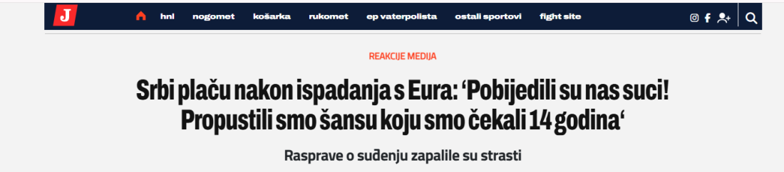 Malo umereniji bio je portal "24 sata" koji je posle debakla Srbije pisao: "Šok za Srbiju! Imala je prolaz u svojim rukama pa ispala s Eura", dok Tportal piše:"Srbija posle drame ispala s Evropskog prvenstva".