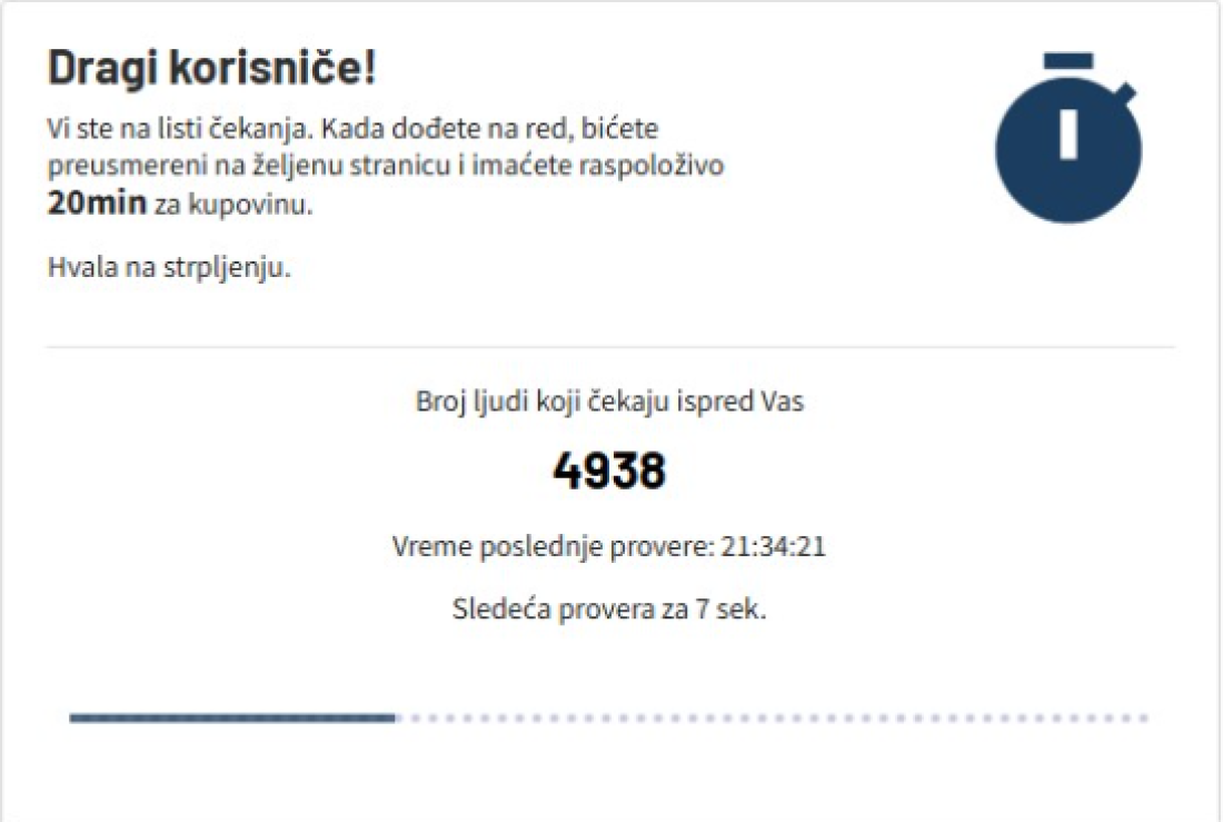 Na online platformi za prodaju ulaznica zabeležena je ogromna navala. Večeras se oko 21.30 časova, u virtuelnom redu za kupovinu nalazilo se skoro 5.000 zainteresovanih, koji su čekali priliku da dođu do svojih mesta. Kupce je dočekala poruka da su stavljeni na listu čekanja, uz napomenu da će, kada dođu na red, imati 20 minuta da završe kupovinu.