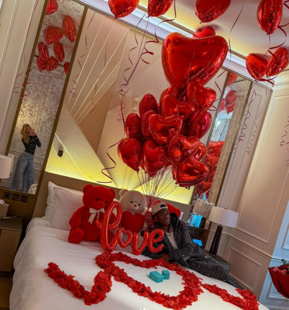 U pozadini su baloni u obliku srca, plišani medvedi, crvene ruže i natpis "Love" na pokrivaču, dok su na krevetu postavljena i dva slova "V" - očigledna simbolika njihovih imena.