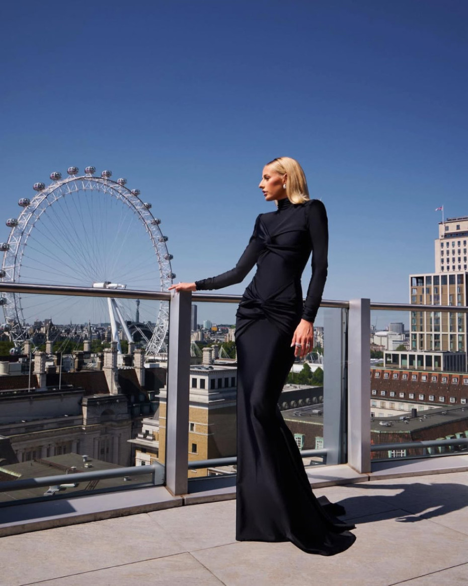 Radi se o providnom modelu haljine, koji je u potpunosti prekriven sitnim kristalima i perlicama, te stvara izgled poput mreže koja svetluca pri svakom pokretu. Model je, kao što se može videti na fotografijama ispod, krojen uz telo, naglašava siluetu i ima visoki šlic sa strane koji dodatno ističe noge.