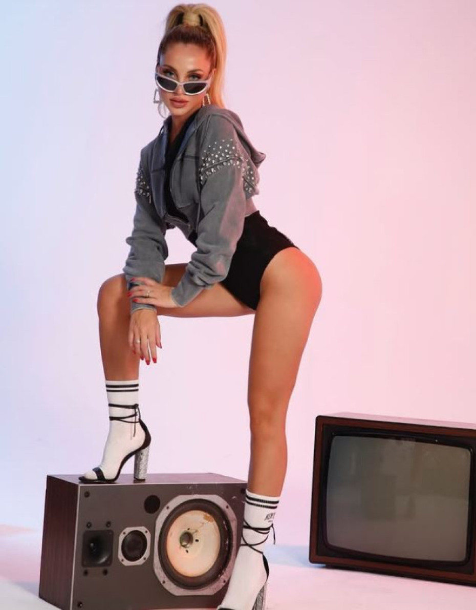U oči odmah upadaju hot snimci iz studija u ultrakratkom miniću i čipkastim čarapama, gde zavodljivo diže i namešta nogu. Nije to ništa. Tek fotke u bikniju na plaži, u tanga kupaćem, frajerima odmah udari u glavu.