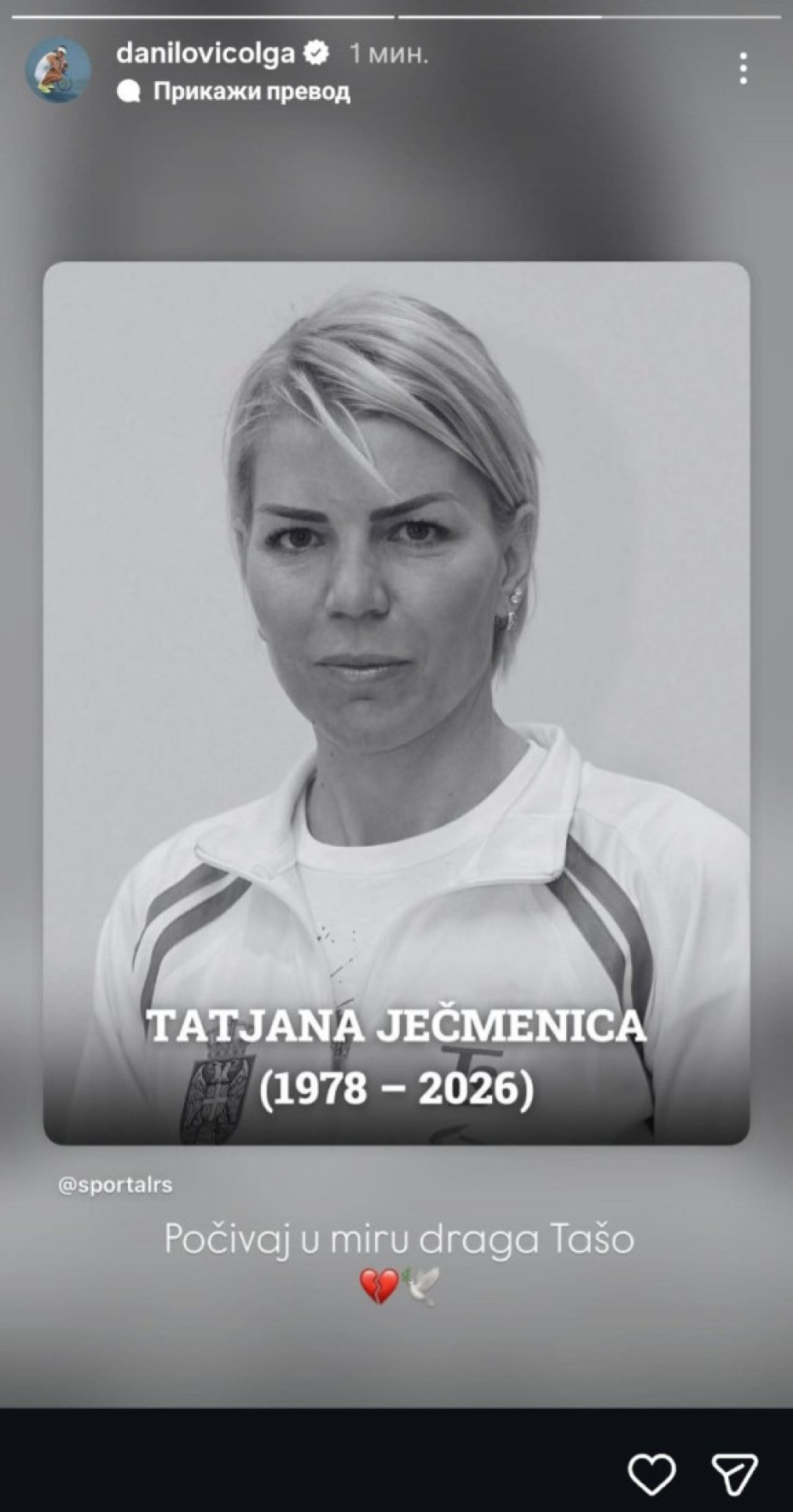 Vest o tragičnom gubitku nekadašnje teniske selektorke duboko je potresla sportsku javnost, a brojni sportisti i javne ličnosti uputili su poruke saučešća. Među njima našla se i lga Danilović, koja je na svom "Instagram" profinuo oprostila od Ječmenice.
