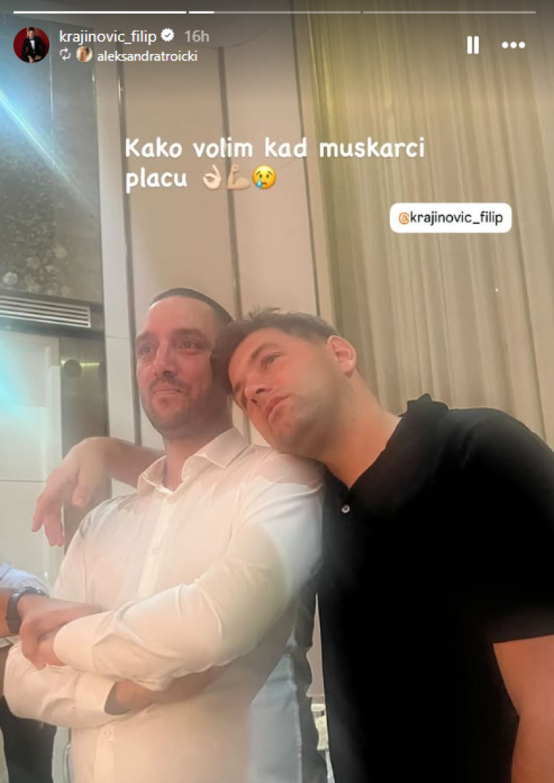 "Kako volim kad muškarci plaču", napisala je ona u opisu fotografije na kojoj se Krajinović naslonio na rame Viktoru.